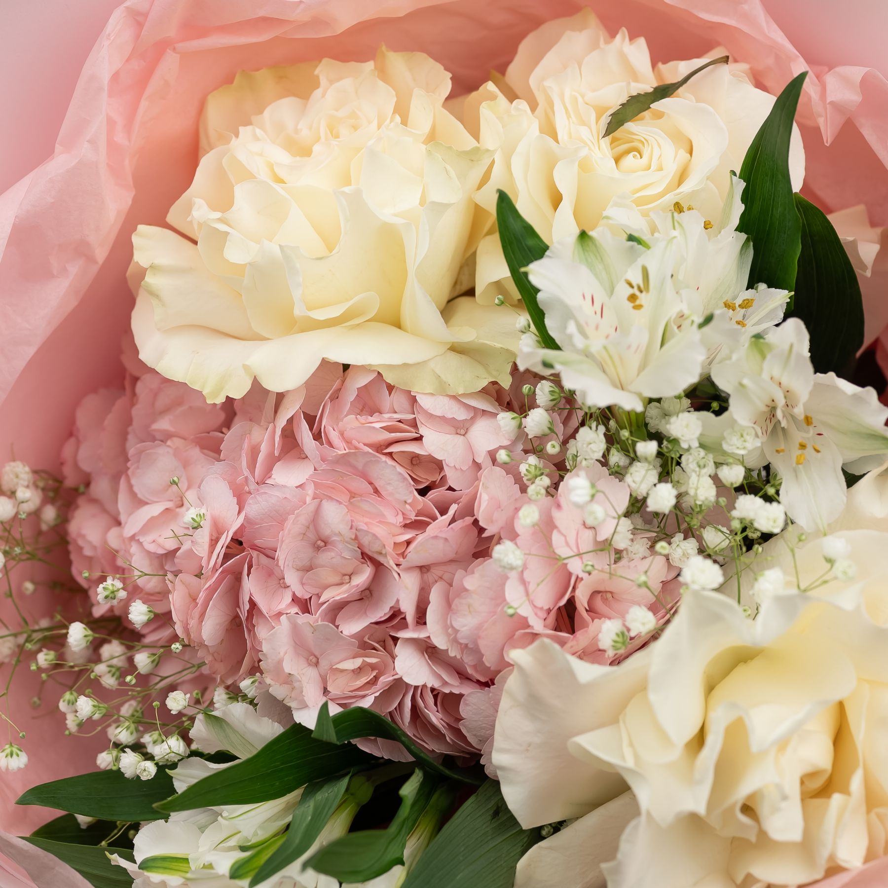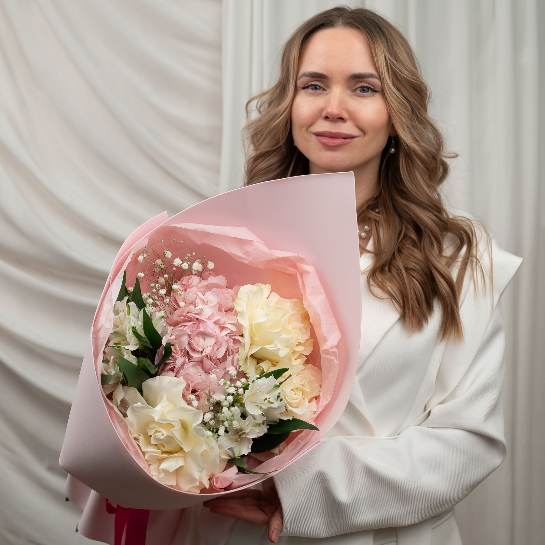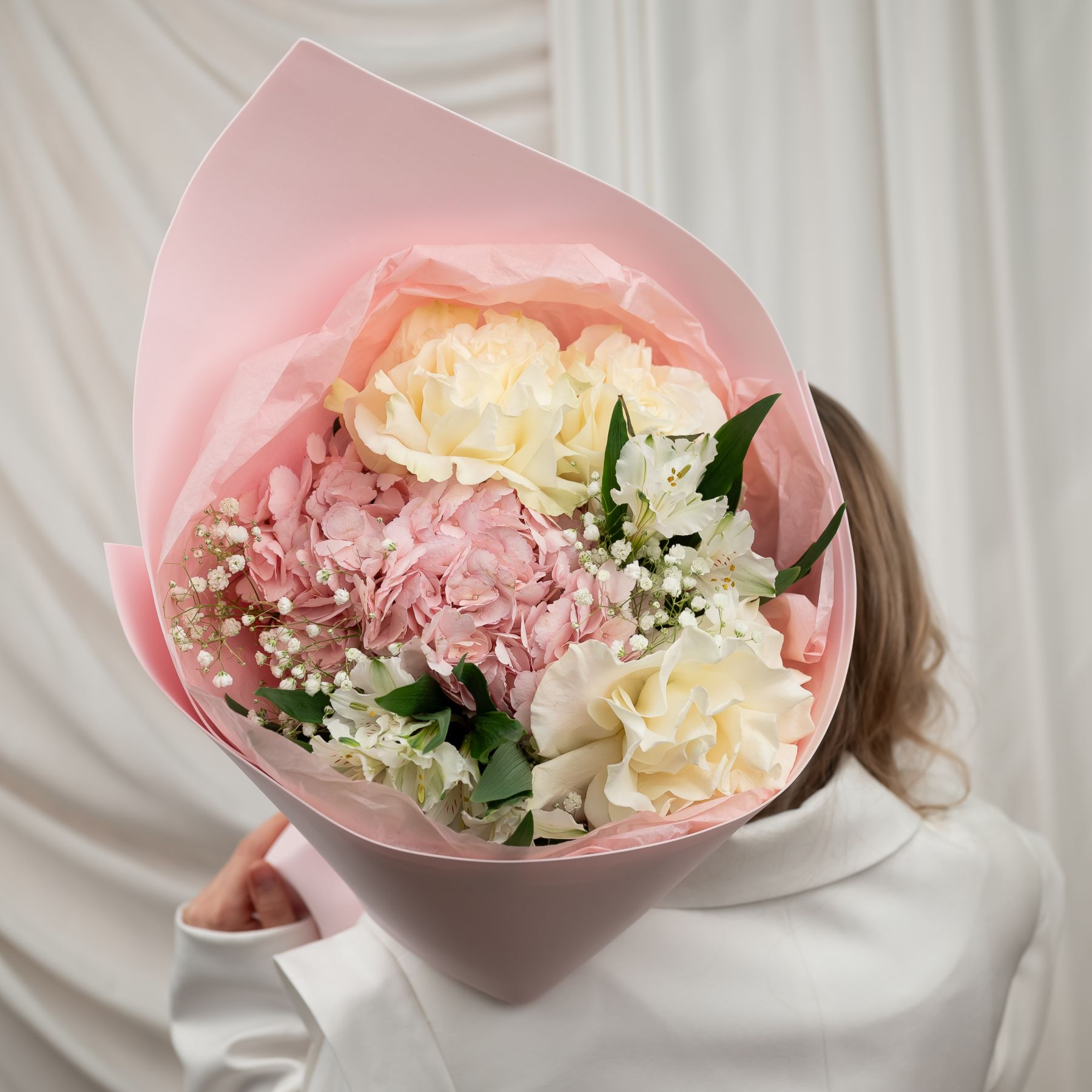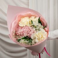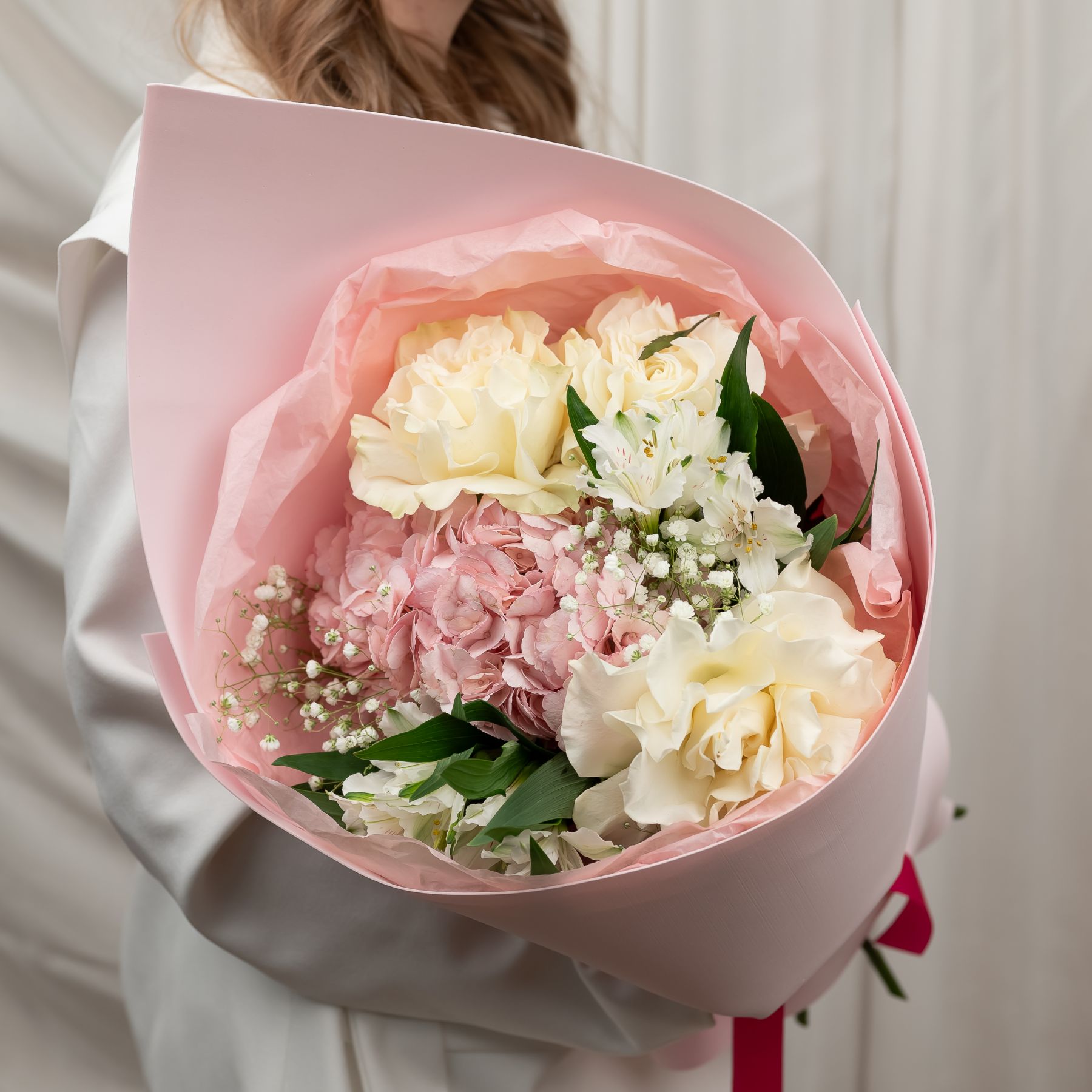 Состав: гортензия - 1 шт гипсофила - 1 шт французская роза Мондиаль - 3 шт альстромерия - 2 шт упаковка фоамиран - 1 шт