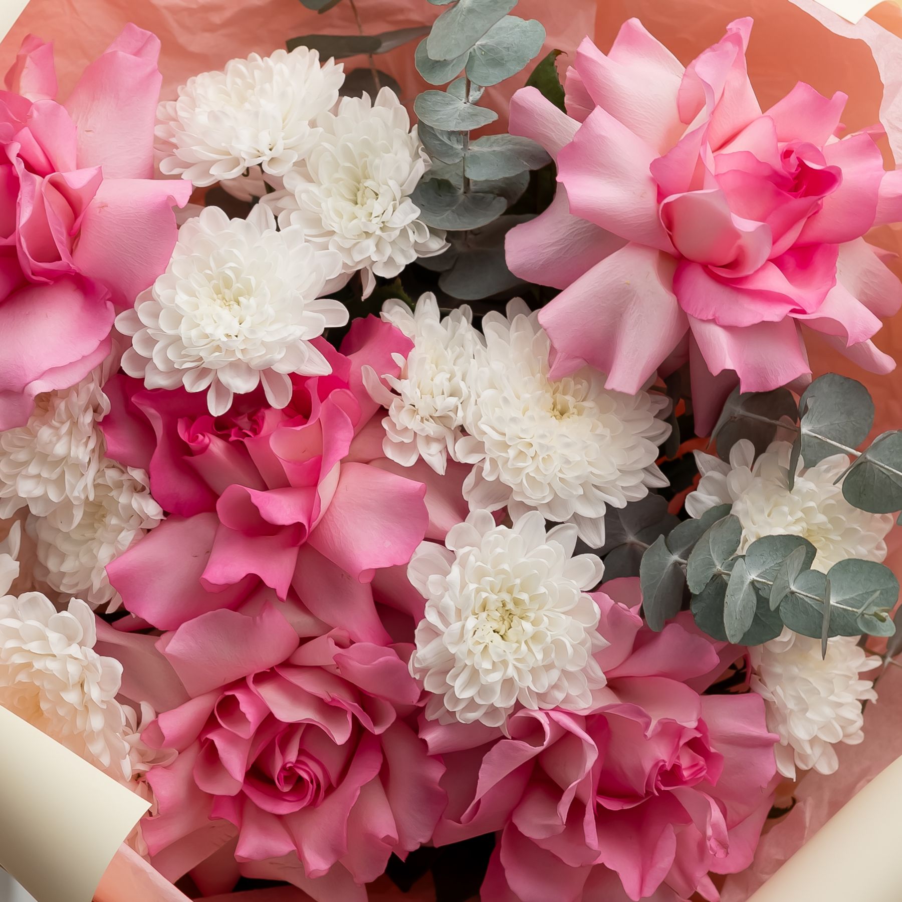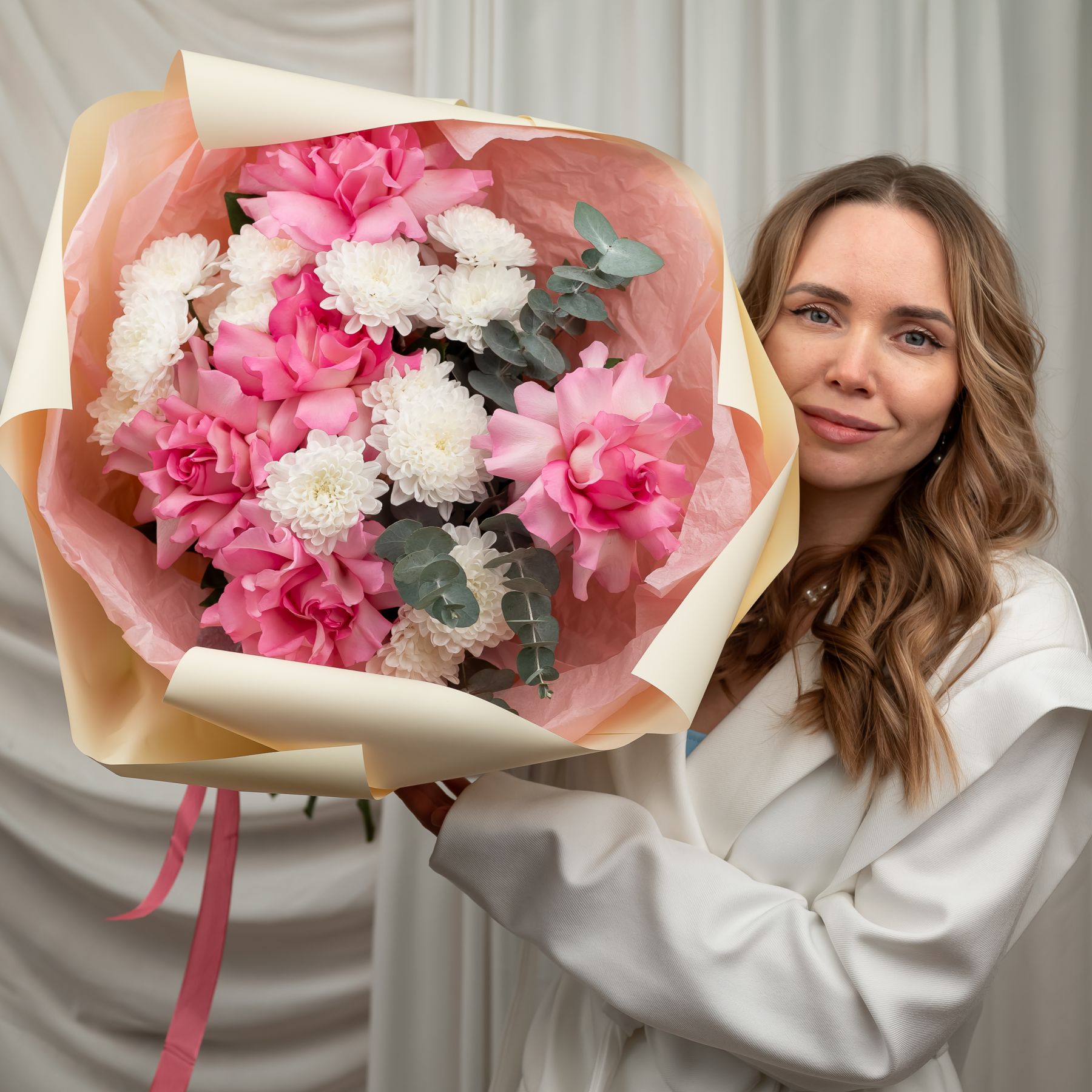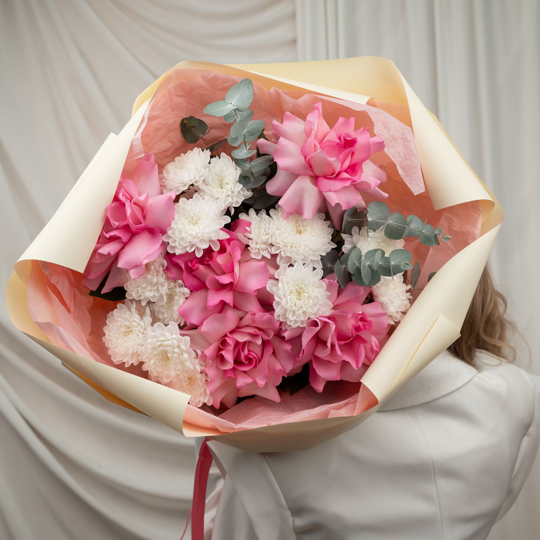 Состав: кустовая хризантема Алтай - 4 шт французская роза розовая - 5 шт упаковка - 1 шт