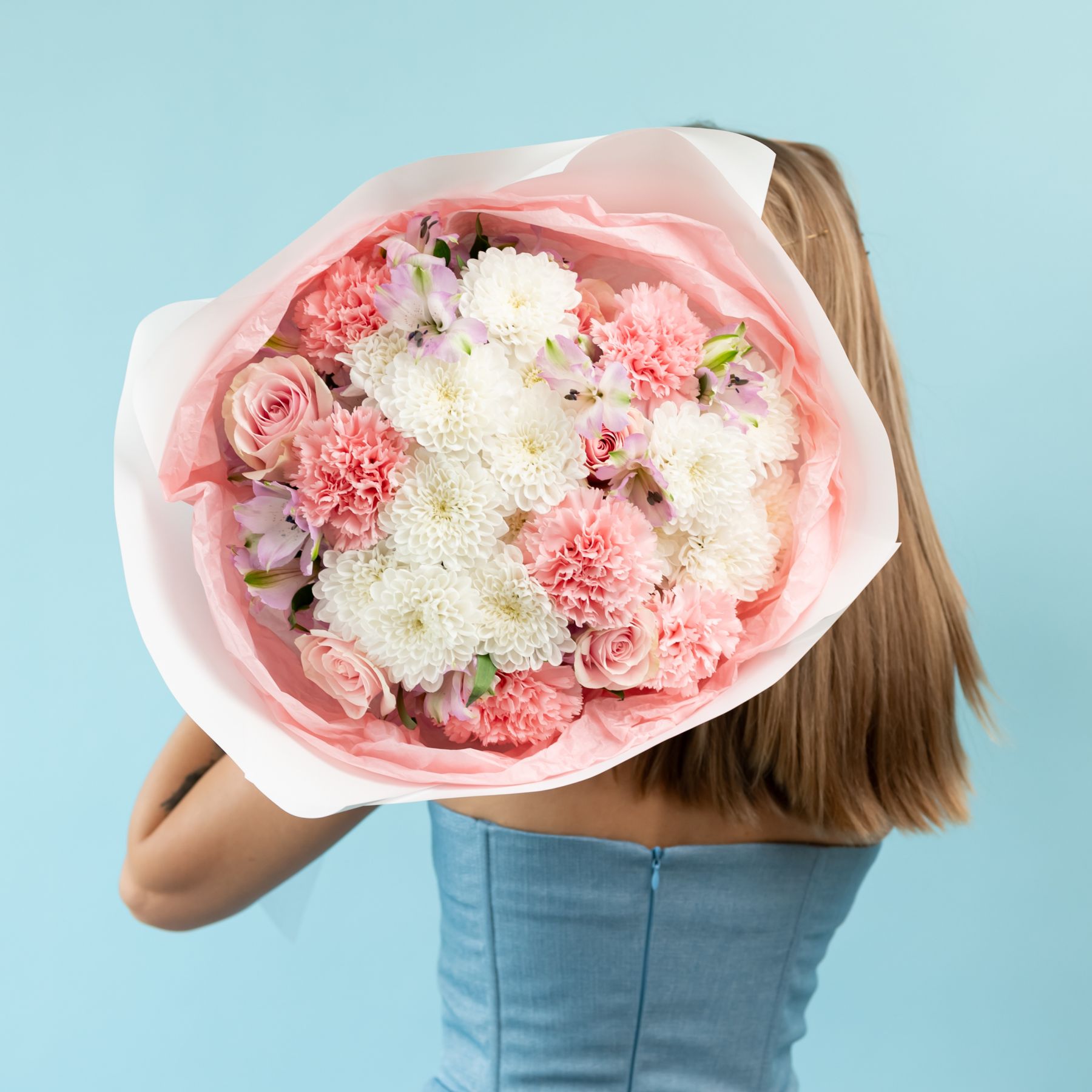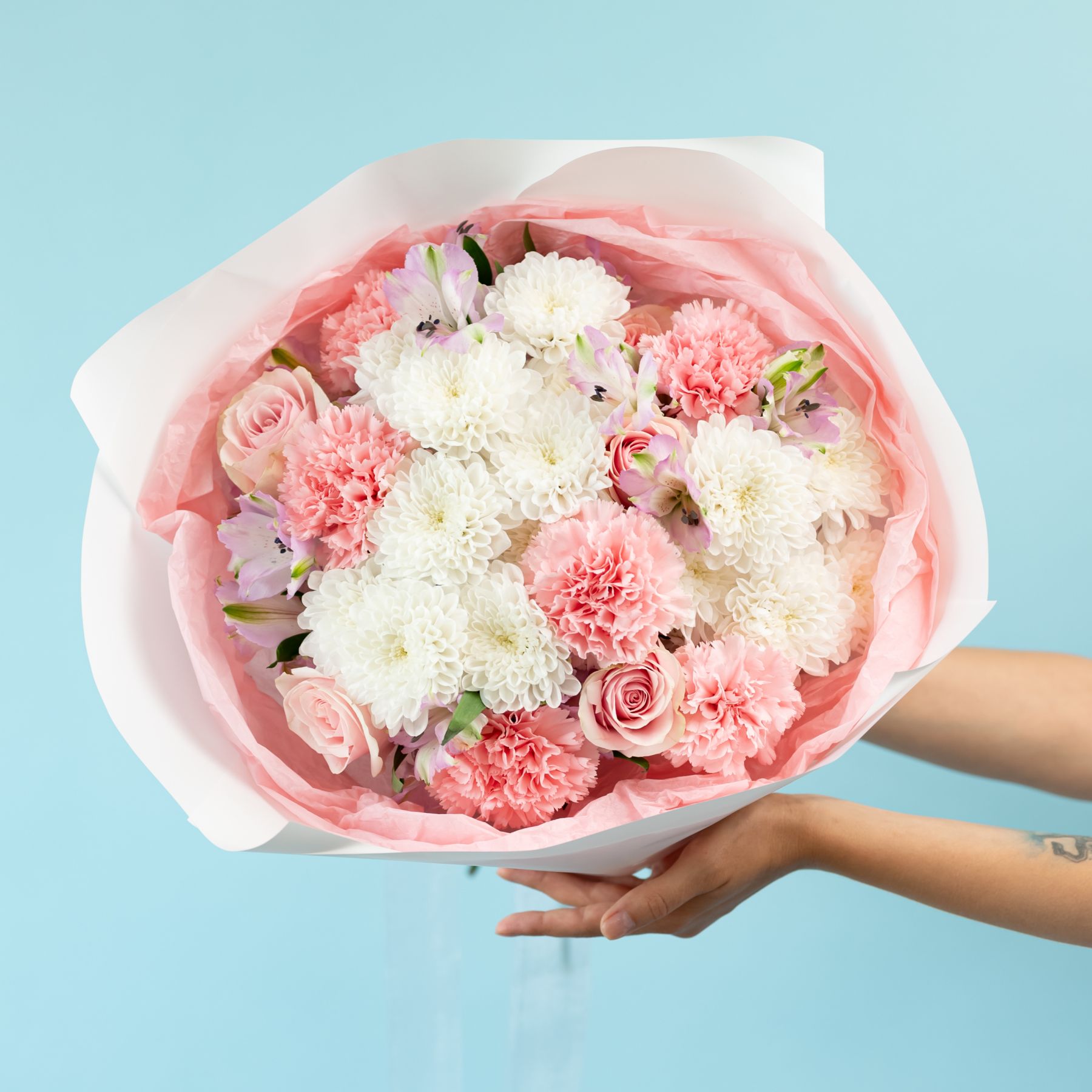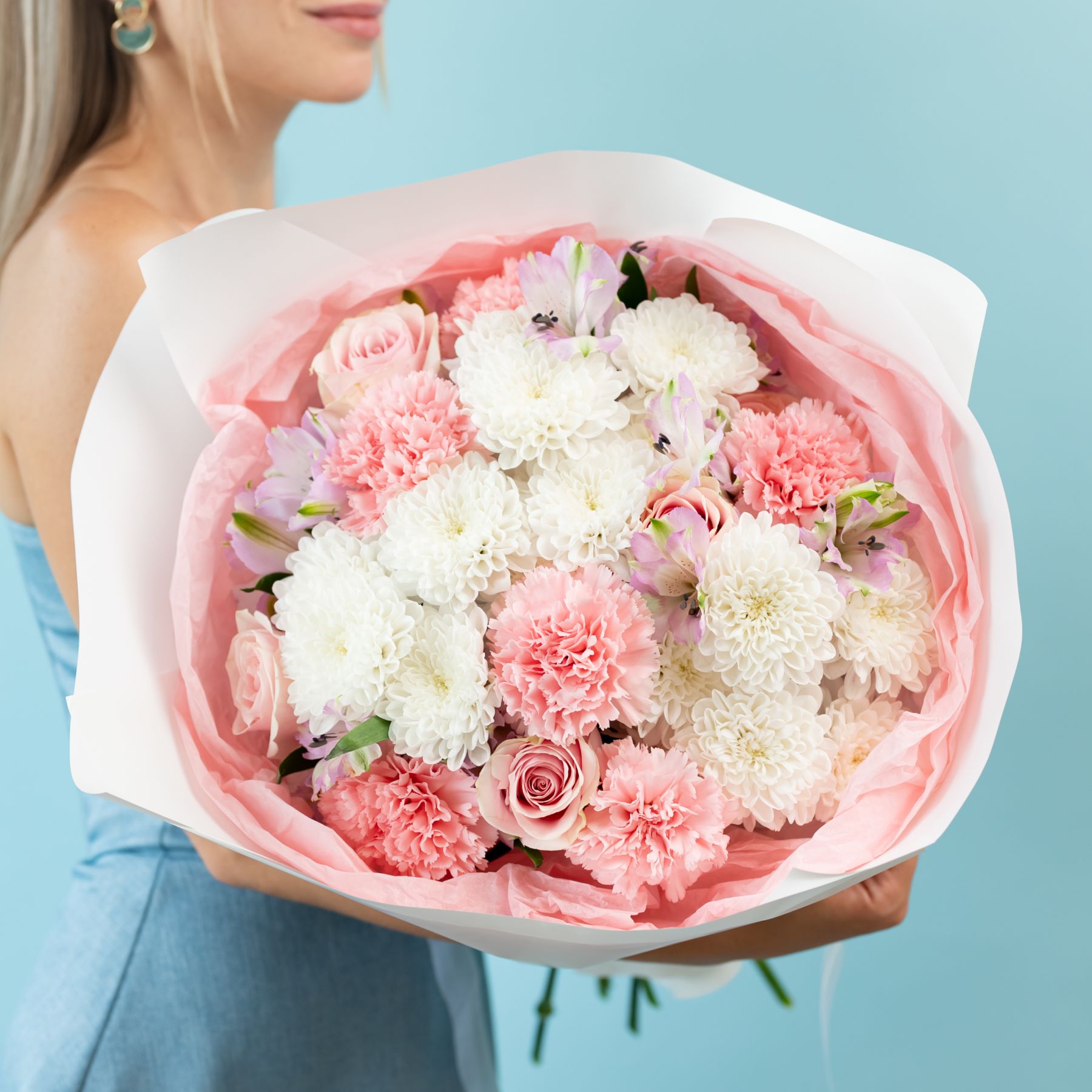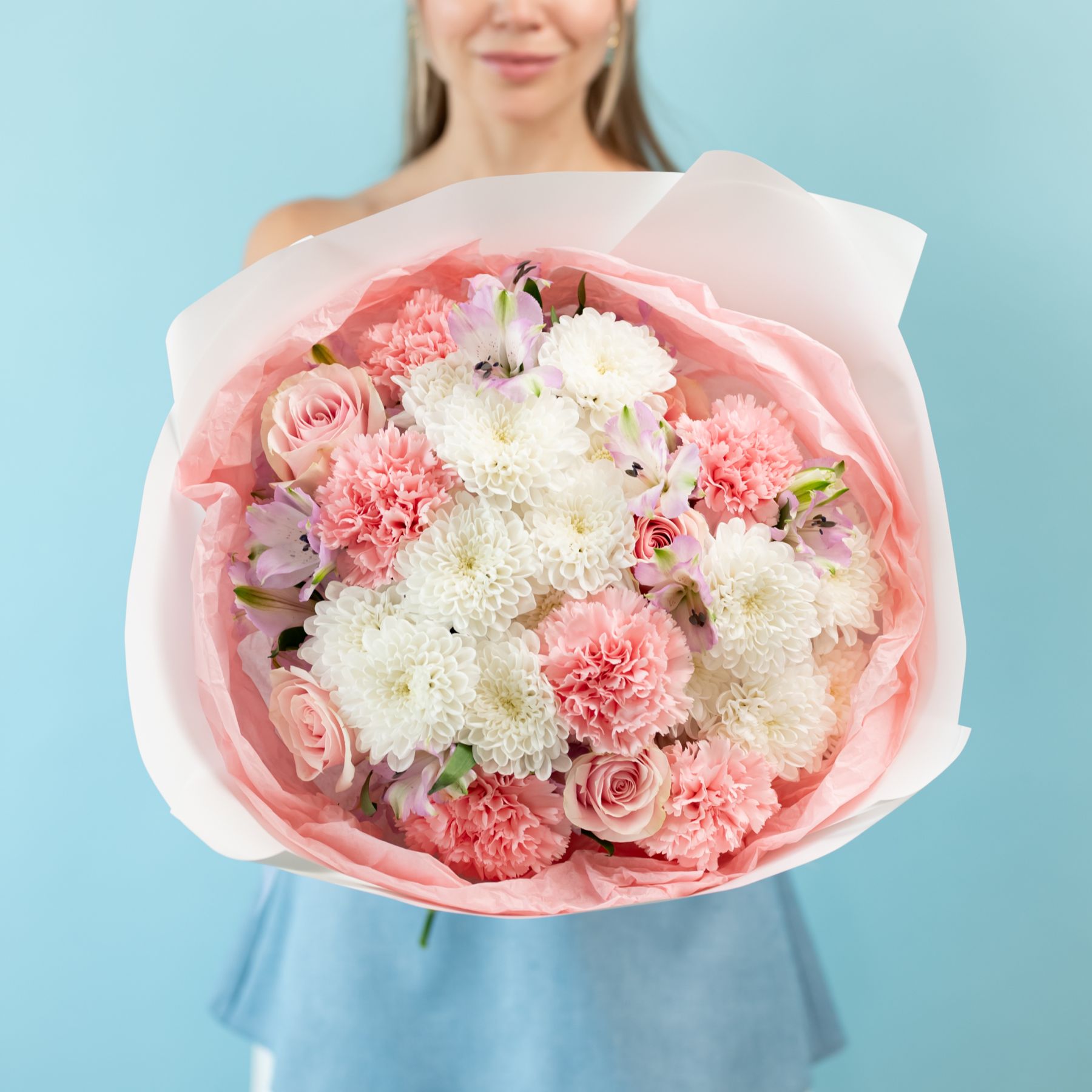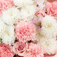 Состав: 6 диантусов, 5 роз, 5 альстр, 3 хриз, упаковка.