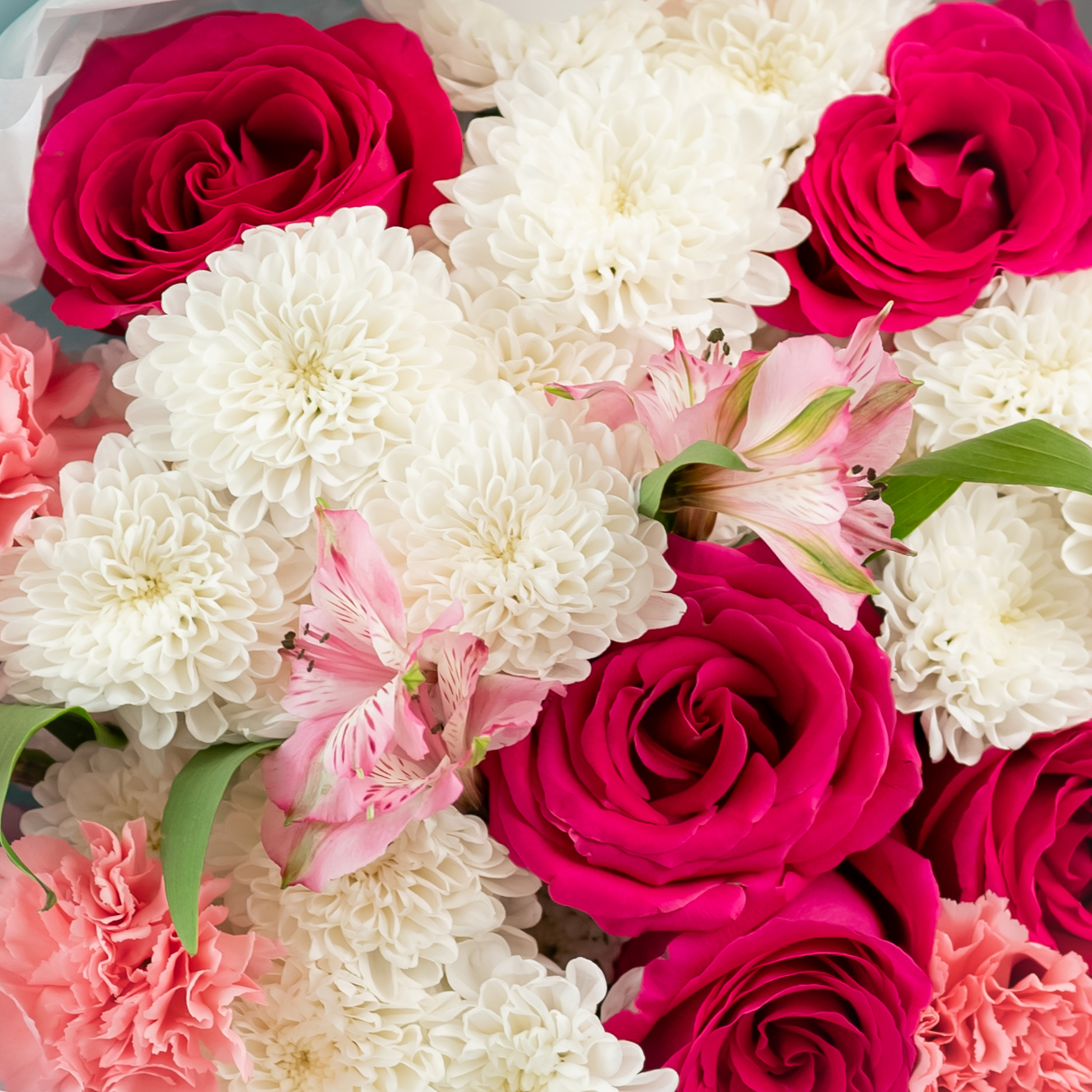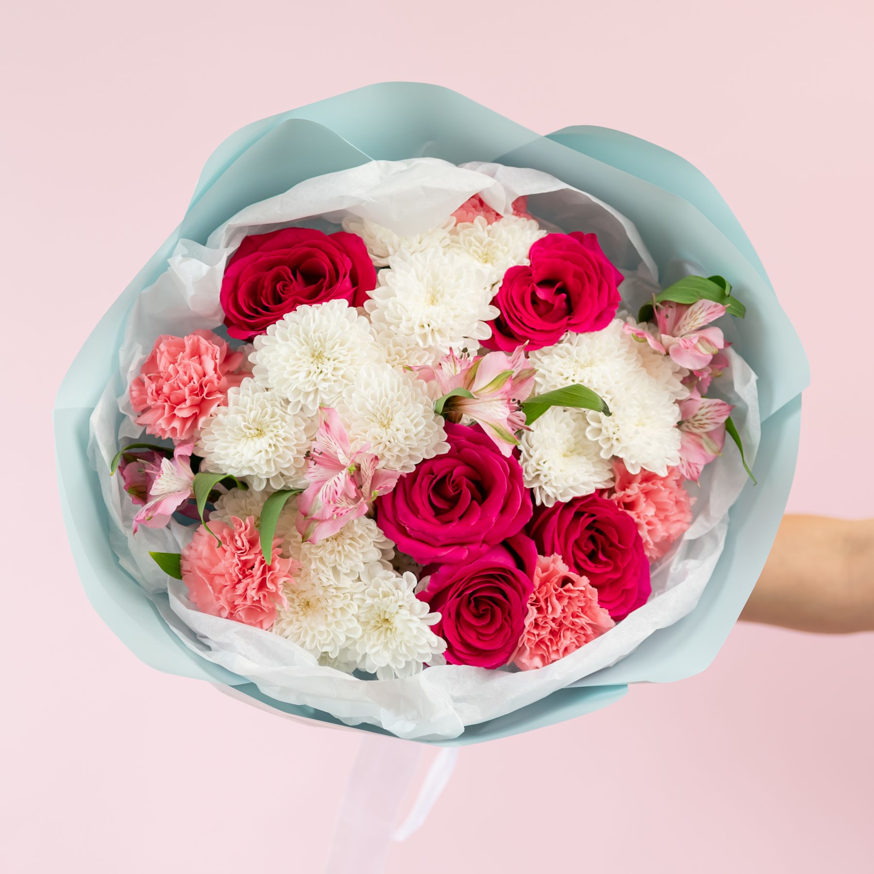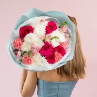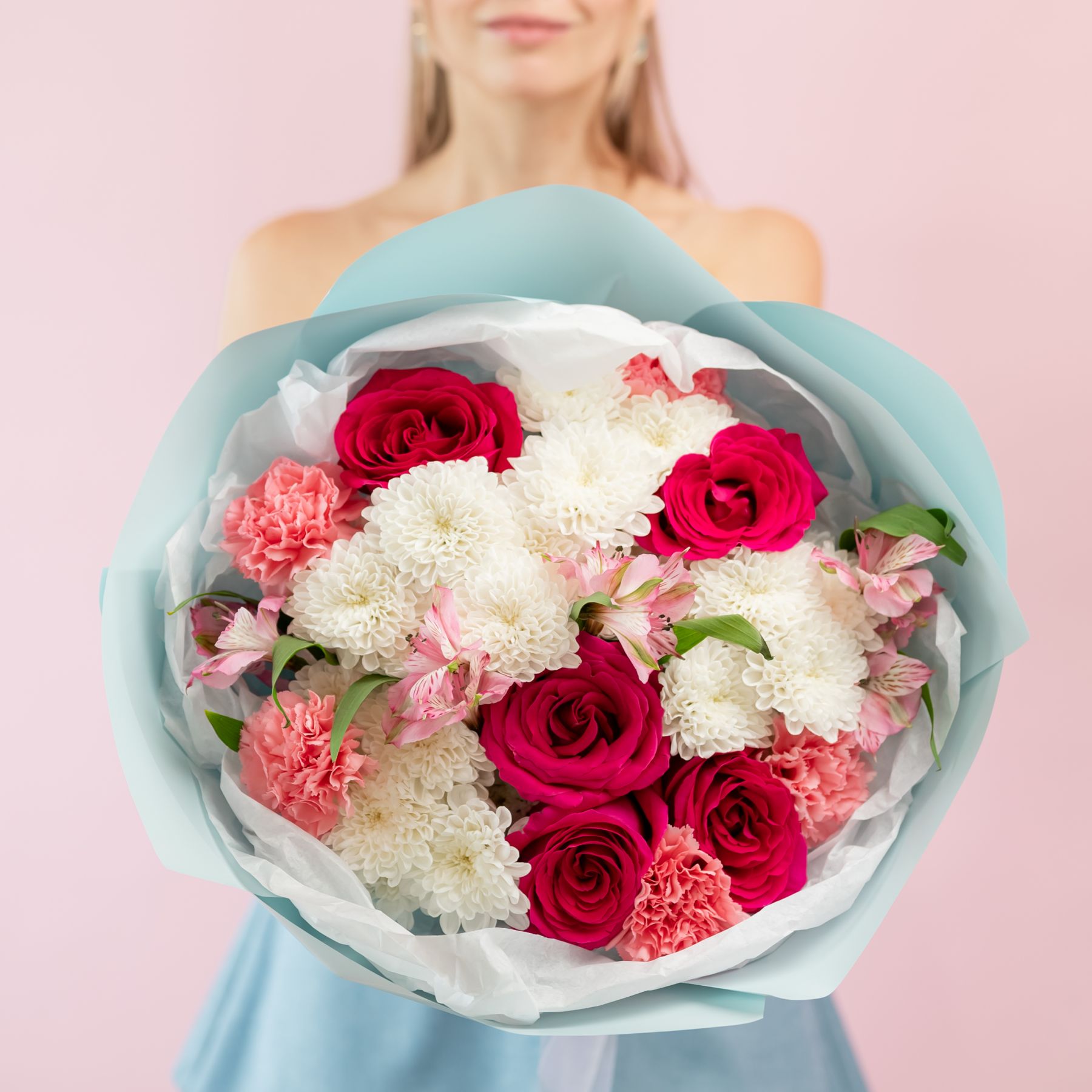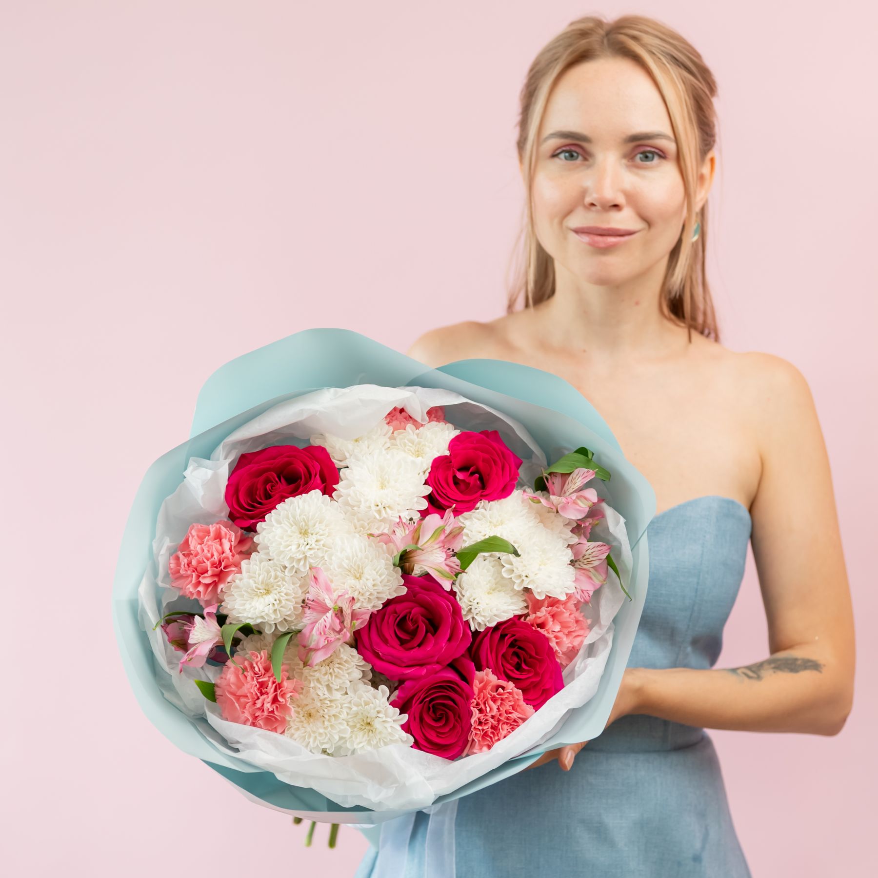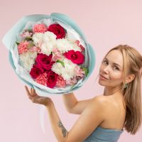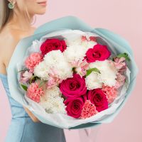 Состав: 5 роз, 5 диантуса, 4 алтая, 4 альстр., упаковка.