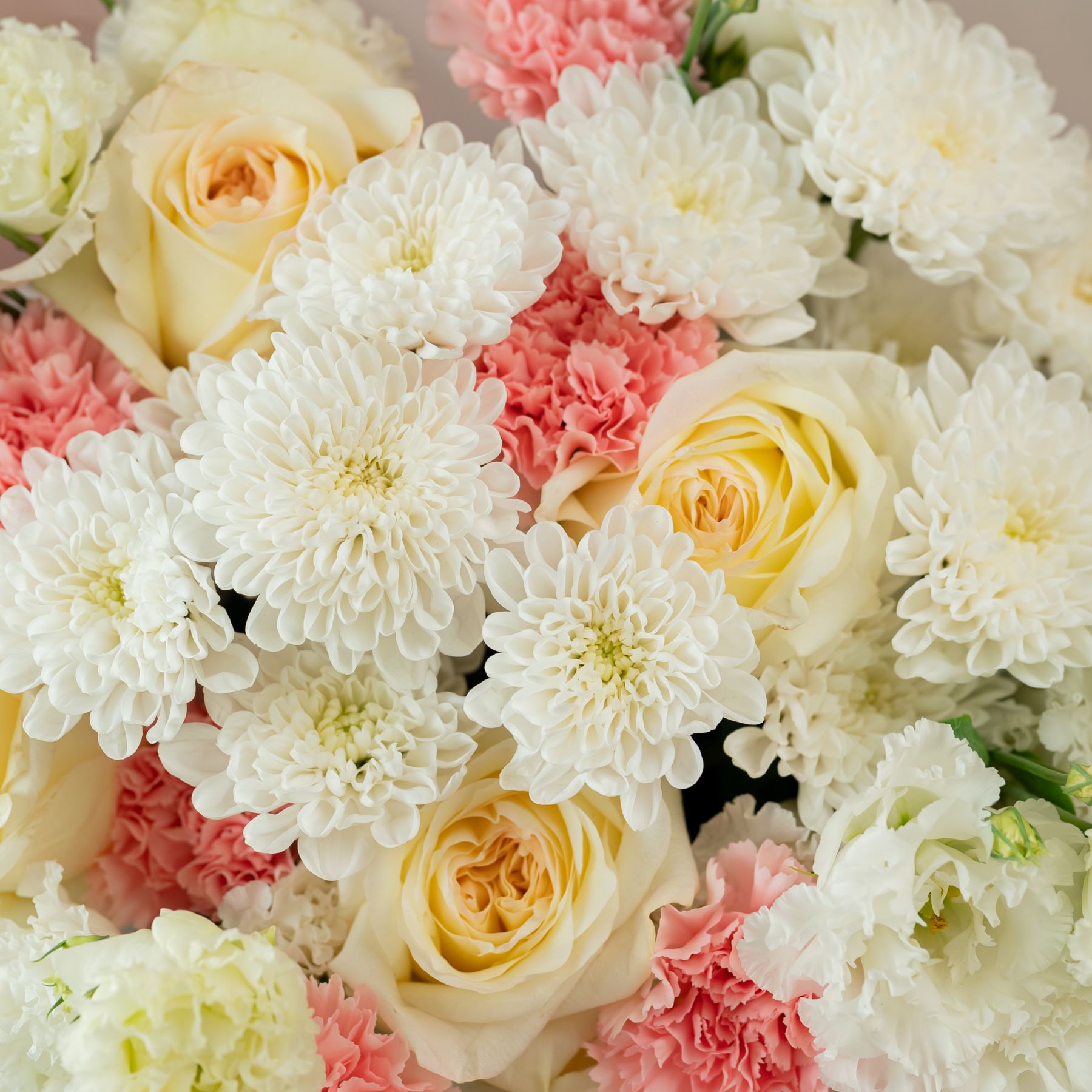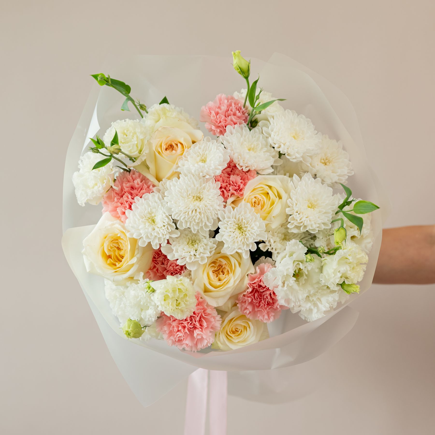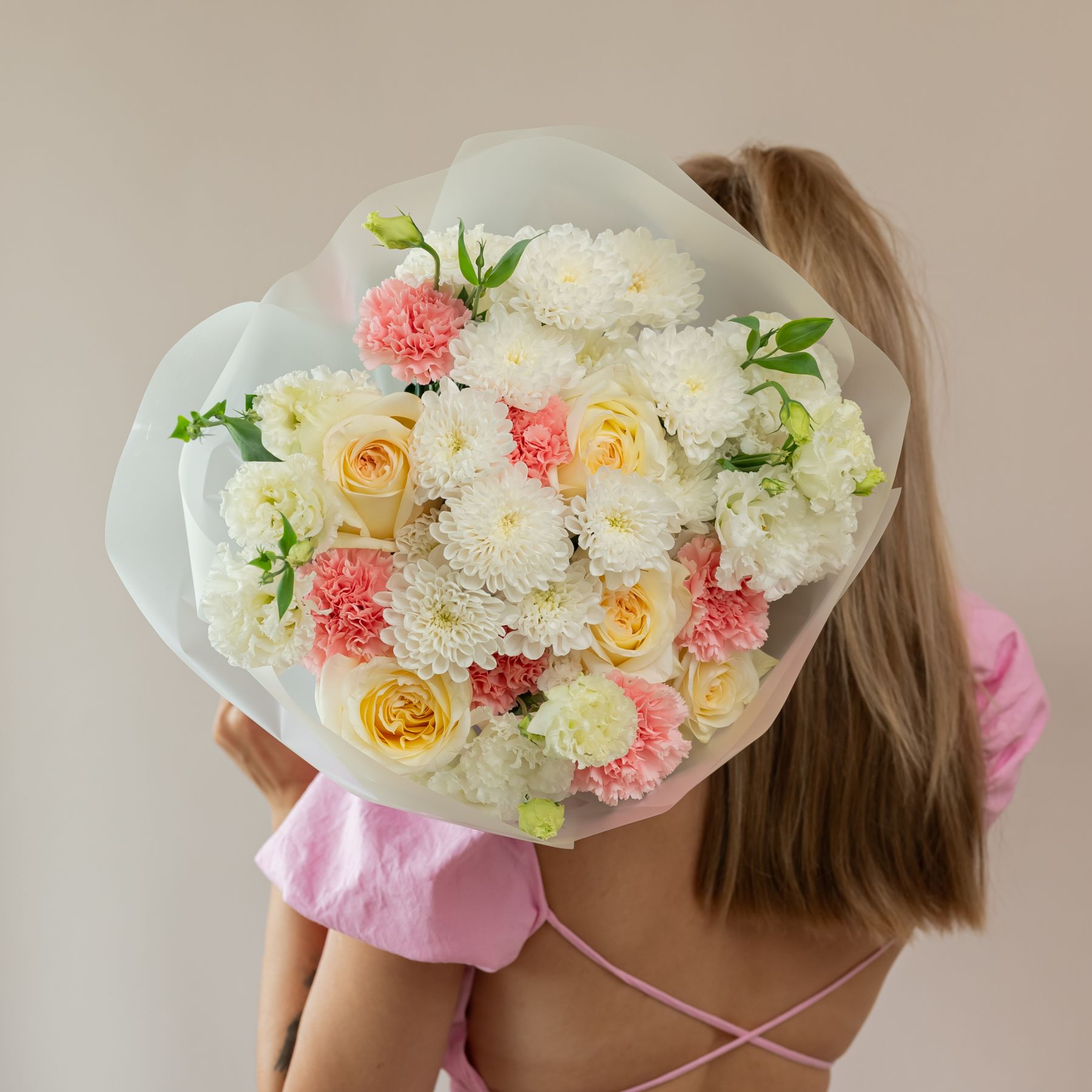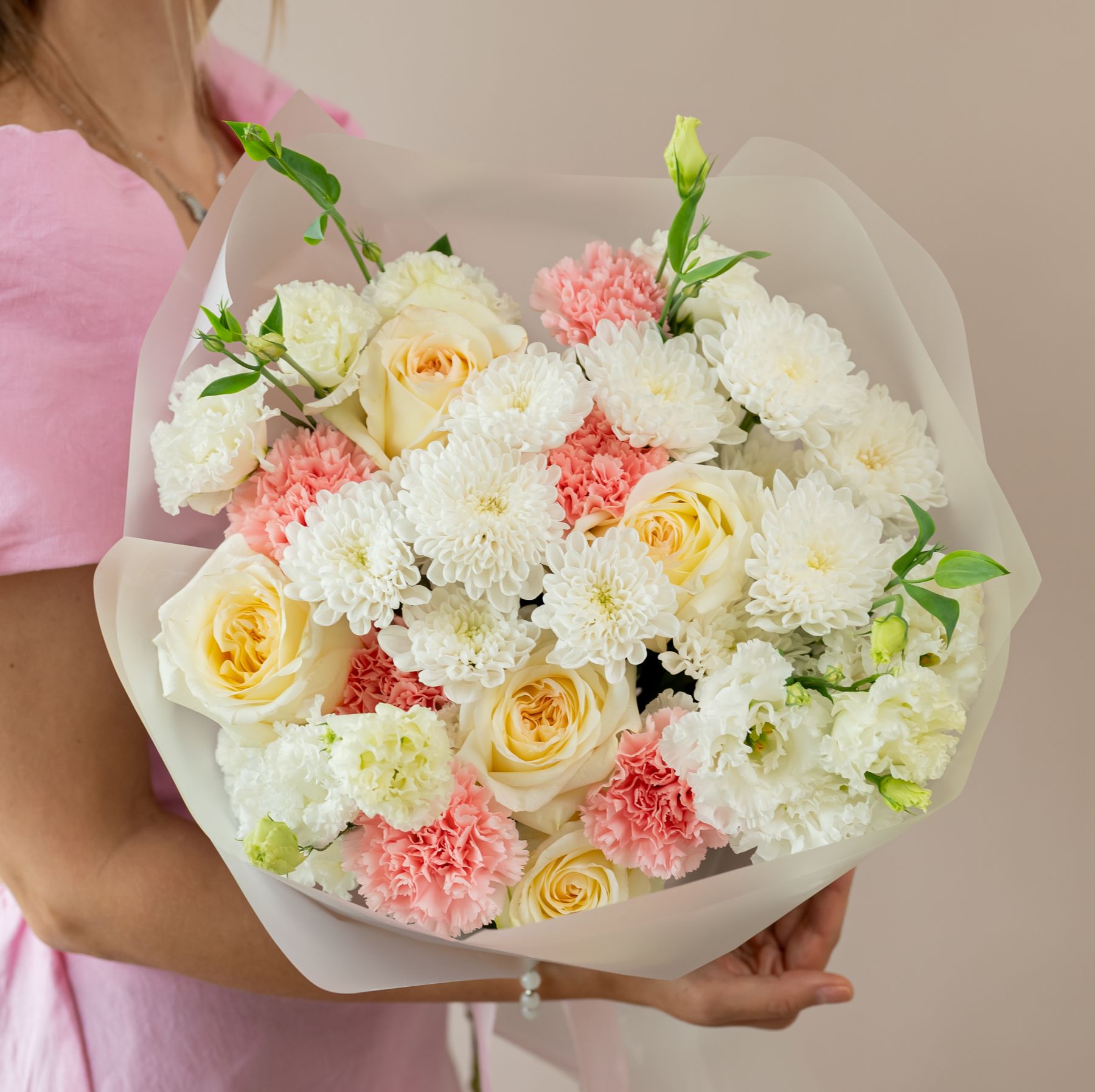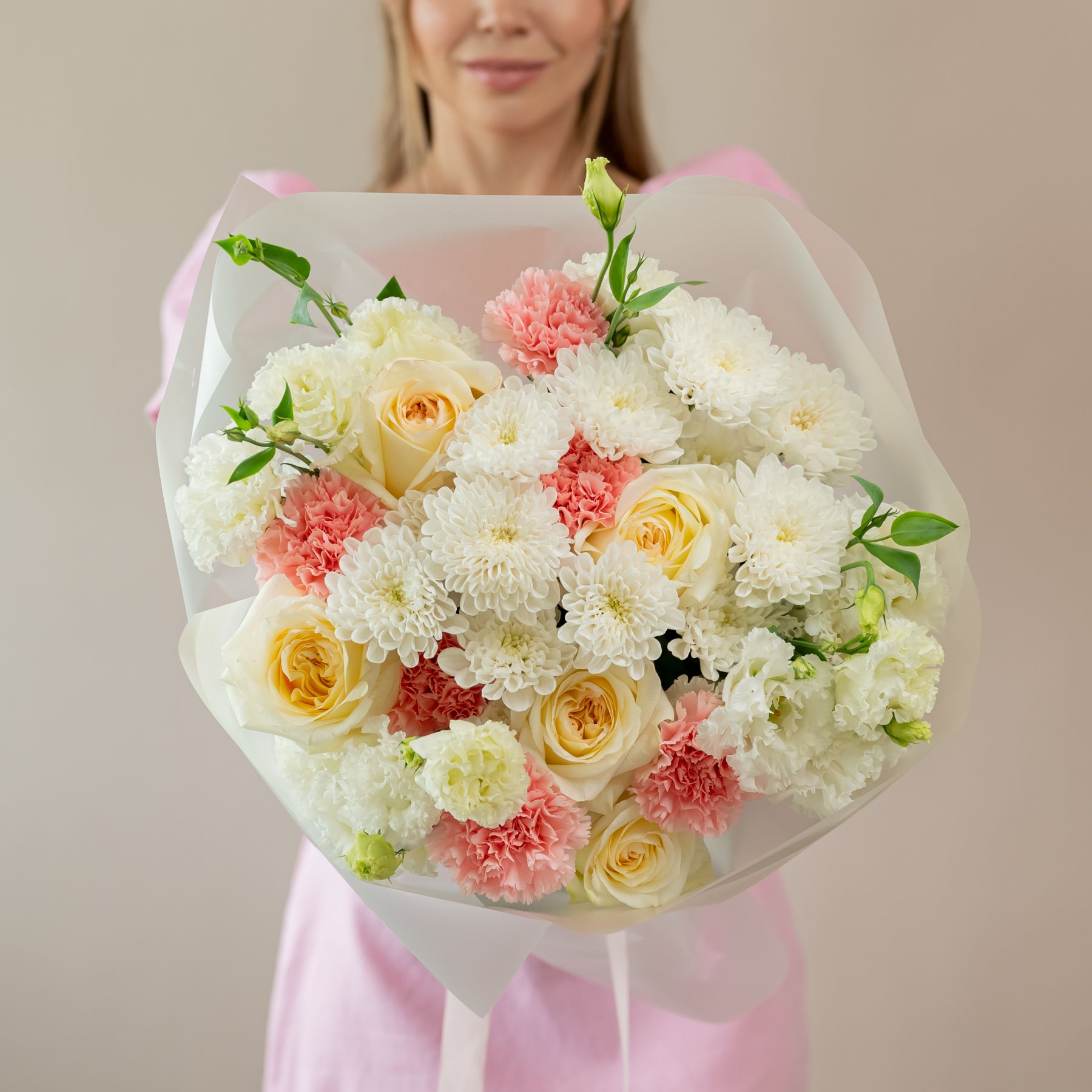 Состав: 5 пион. роз ,2 хриз, 6 диантусов, 4 эустомы, упаковка.